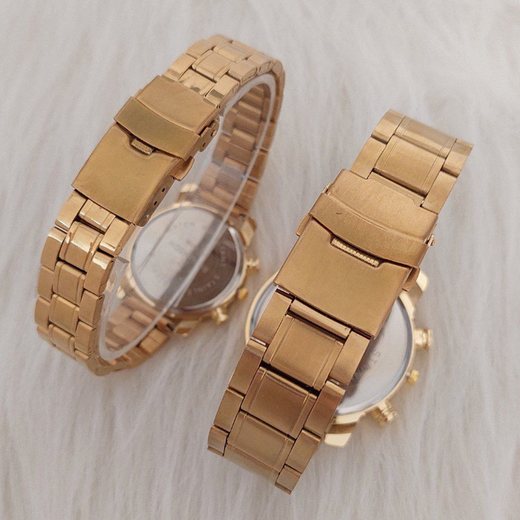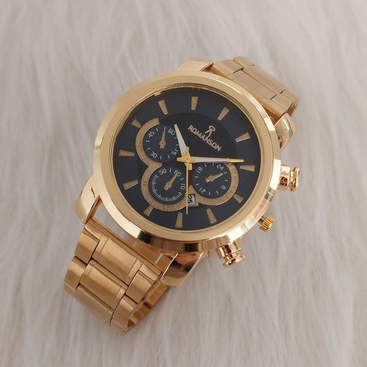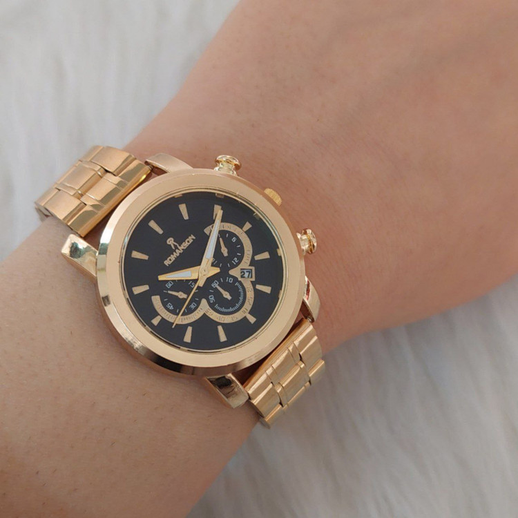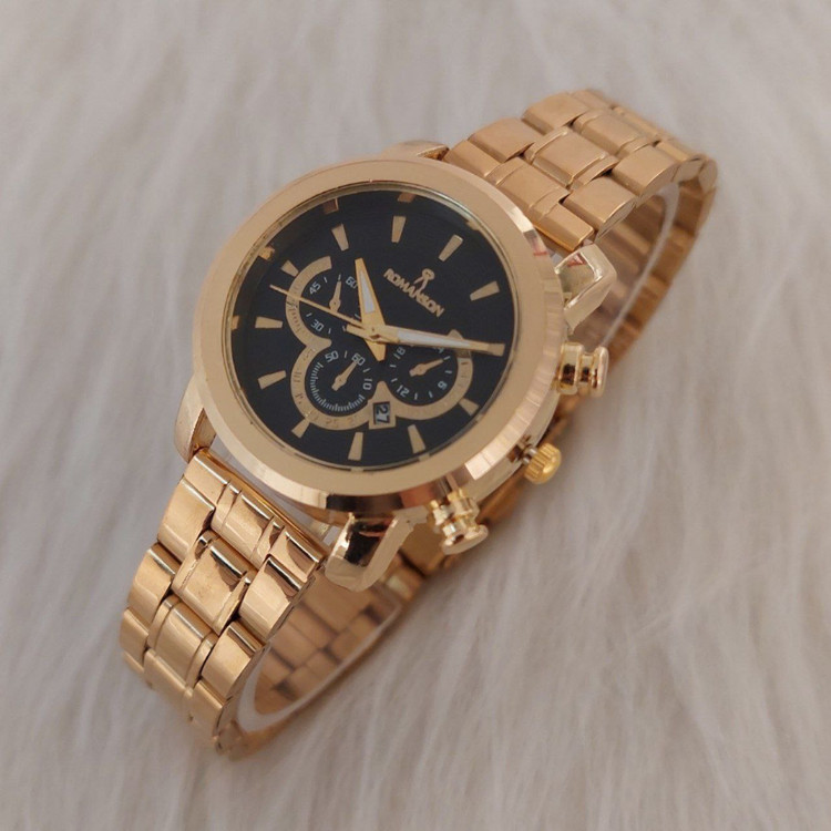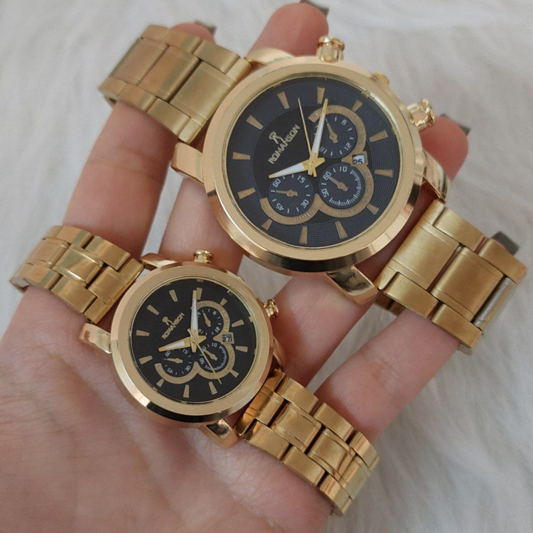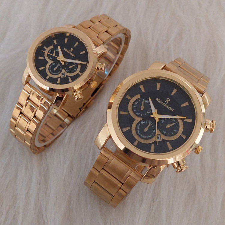 ساعت زنانه و مردانه مارک رومانسون بنداستیل طلایی صفحه مشکی قاب طلایی