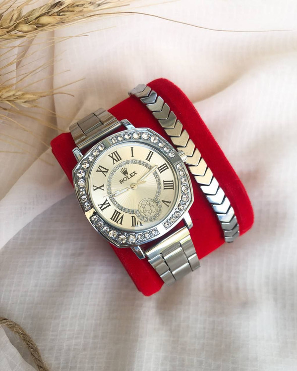 👚نام : ساعت زنانه مارک رولکس مربعی بنداستیل نقره ای صفحه نقره ای همراه با دستبند حدید