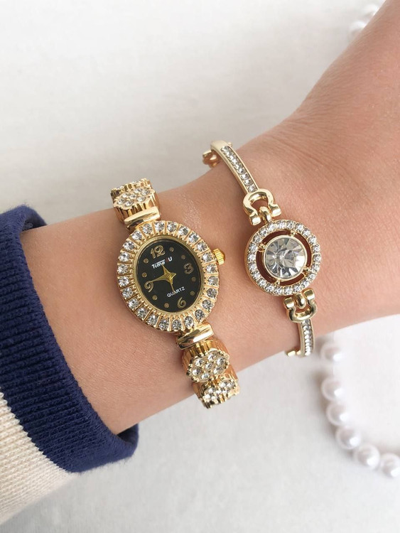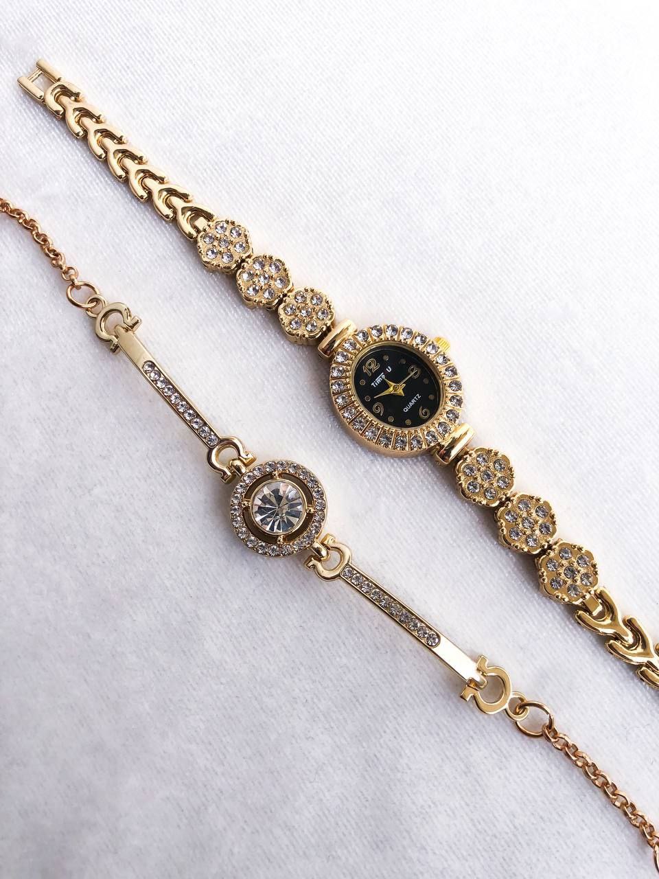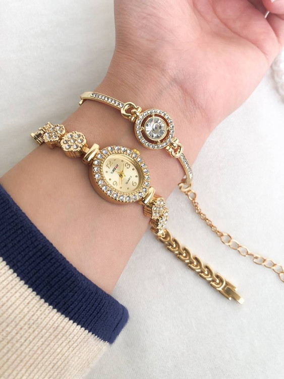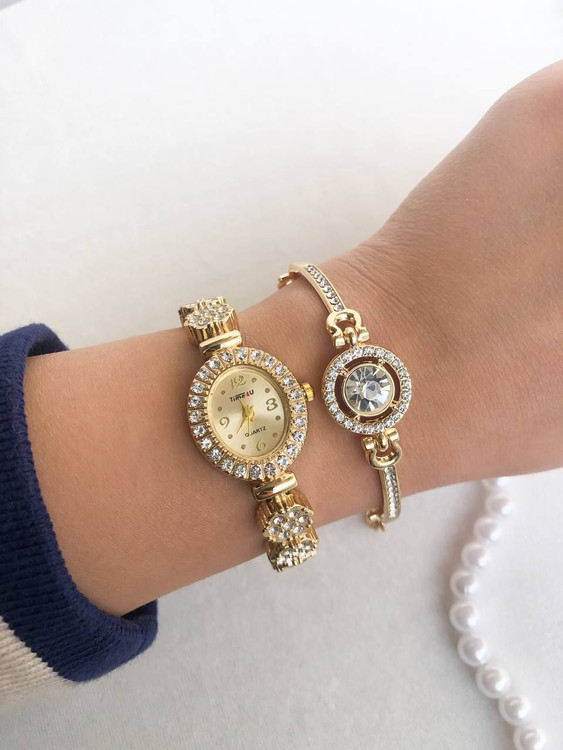 🖌 رنگ بندی : ساعت فول نگین طلایی همراه با دستبند -