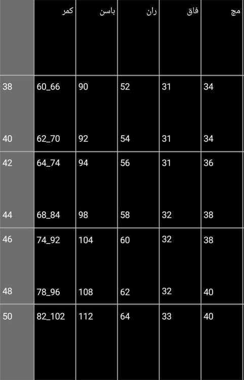 سایز ها : 38, 40, 42, 44, 46, 48, 50