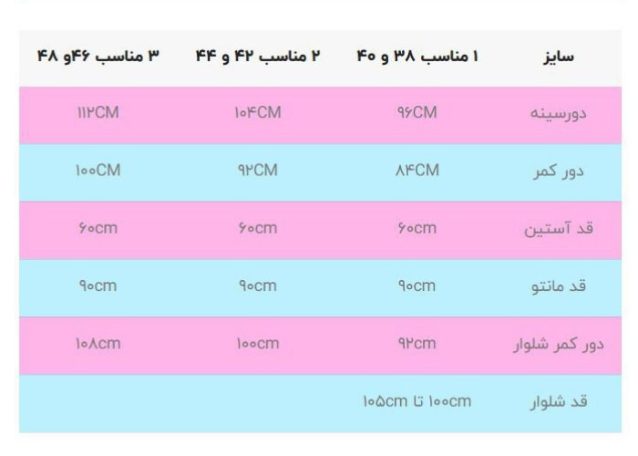 سایز ها : سایز ۱ مناسب ۳۸ و ۴۰, سایز ۲ مناسب ۴۲ و ۴۴, سایز ۳ مناسب ۴۶ و ۴۸